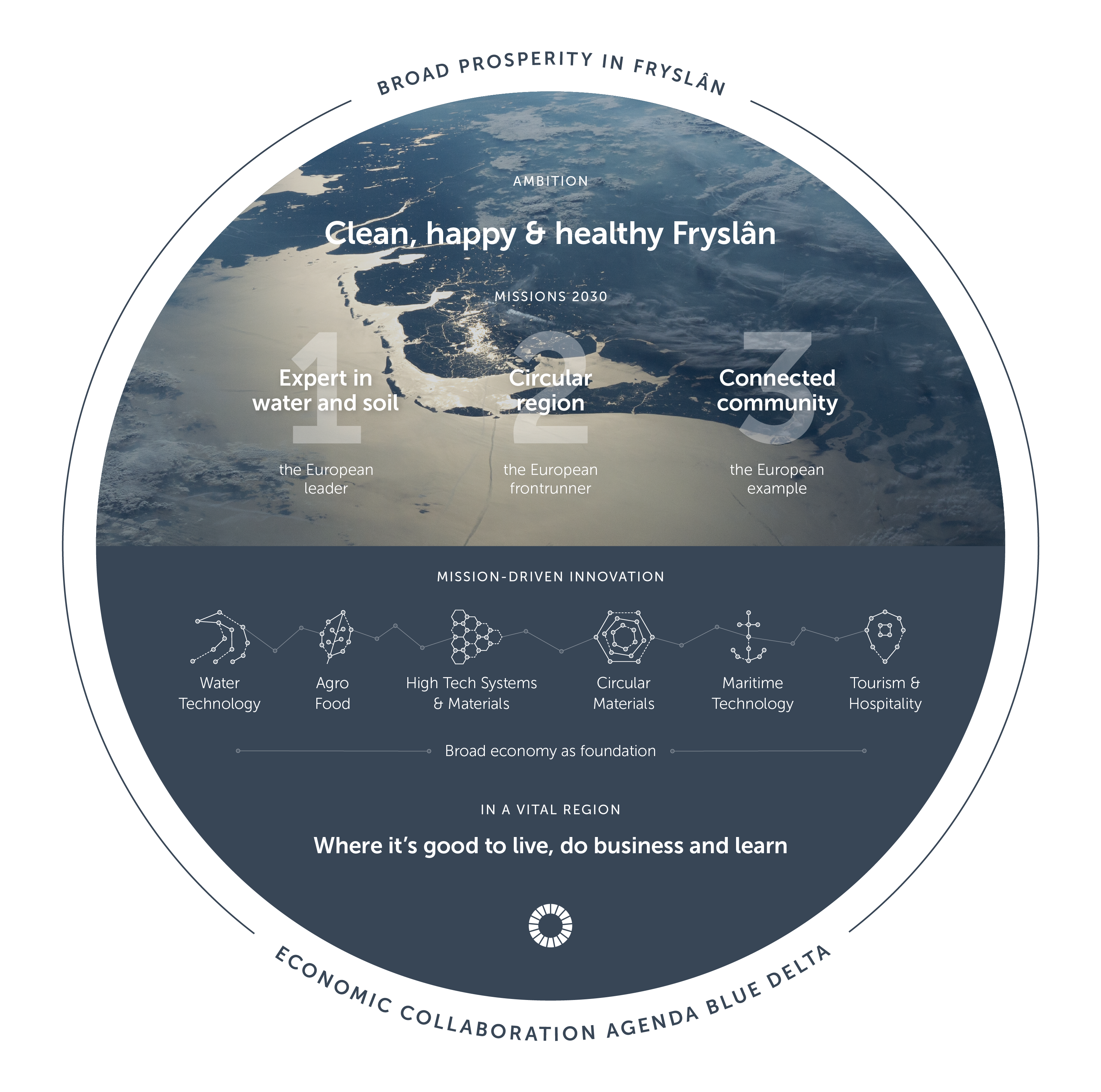 The Frisian Economic Agenda (Blue Delta Approach) focuses on six key sectors. These sectors underline the region’s competitive advantages and foster innovation and investments. The companies in these sectors form regional clusters together with governments, educational institutions and finance. Moreover, these sectors are being used as regional living labs, through which the companies in these sectors make worldwide impact, such as for water (Water Technology).[1]